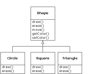 A second example is the classic “shape” example, perhaps used in a computer-aided design system or game simulation. The base type is “shape,” and each shape has a size, a color, a position, and so on. Each shape can be drawn, erased, moved, colored, etc. From this, specific types of shapes are derived (inherited): circle, square, triangle, and so on, each of which may have additional characteristics and behaviors. Certain shapes can be flipped, for example. Some behaviors may be different, such as when you want to calculate the area of a shape. The type hierarchy embodies both the similarities and differences between the shapes.