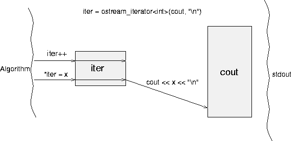 ostream_iterator is another adaptor; it provides output iterator functionality: assigning to the dereferenced iterator will write the data out. The ostream_iterator constructor takes two arguments: the stream to use and the separator. It prints the separator between elements.
